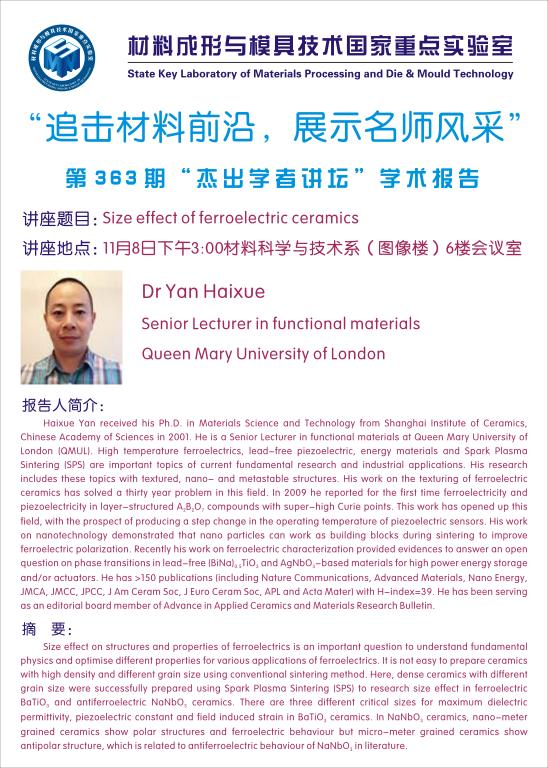 第363期杰出学者讲坛——英国伦敦玛丽女王大学QMUL副教授晏海学