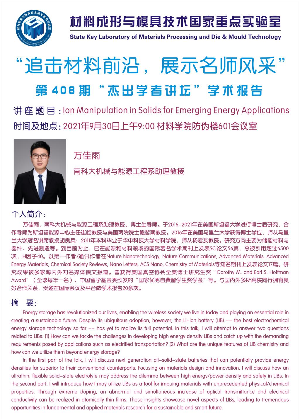 第408期杰出学者讲坛——南方科技大学助理教授万佳雨