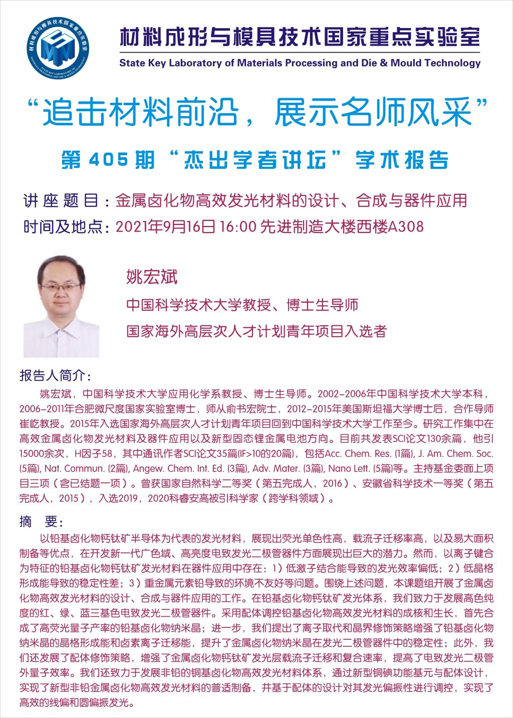 第405期杰出学者讲坛——中国科学技术大学教授姚宏斌
