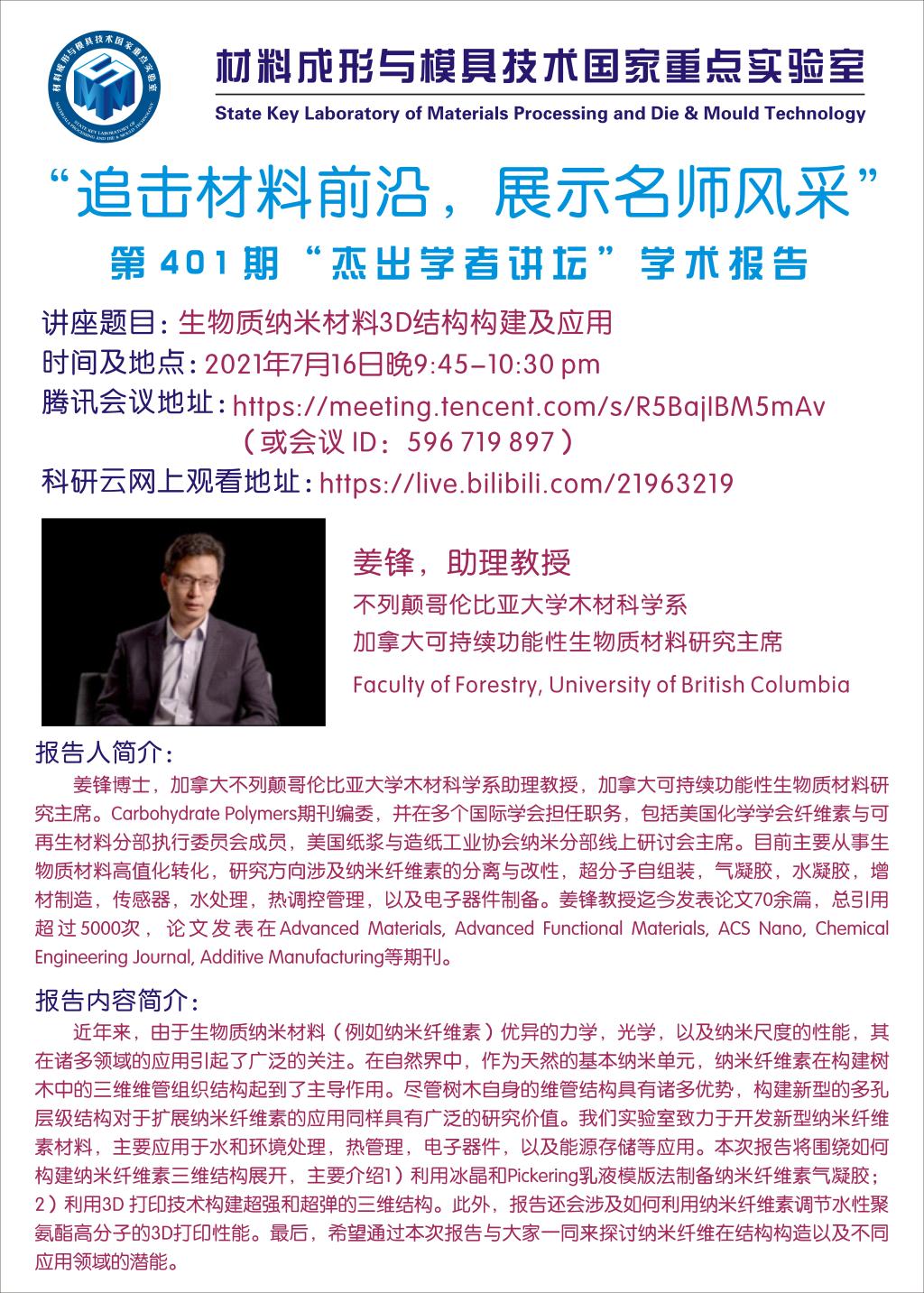 第401期杰出学者讲坛——不列颠哥伦比亚大学助理教授姜锋