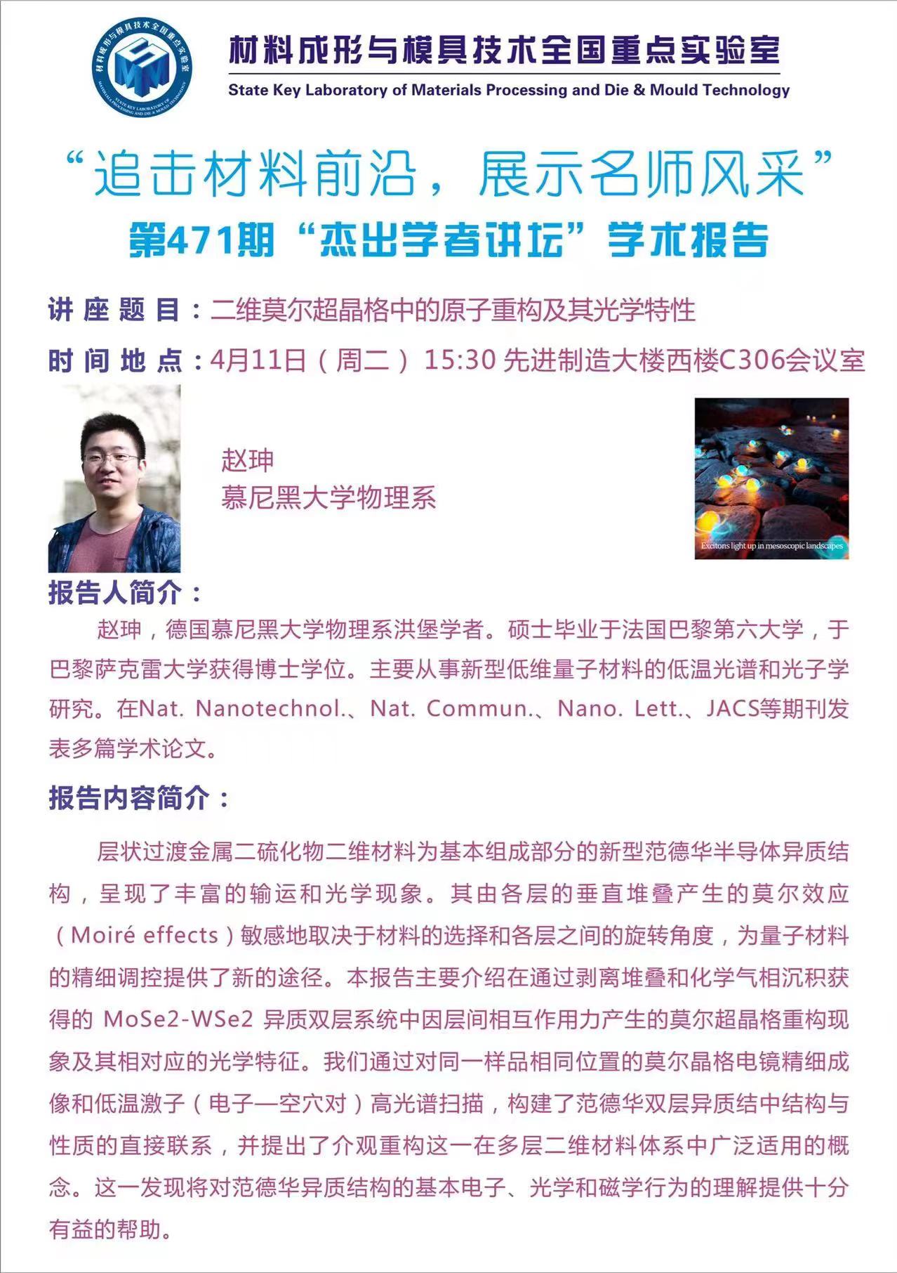 2023年4月11日“杰出学者讲坛”:二维莫尔超晶格中的原子重构及其光学特性